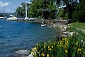 当然午餐会にビールは付き物で、当然のごとくおいしくいただいた。こちらで飲むといつも思うのだが、日本のビールに比べアルコール分が少なく、「う〜、飲んだぁ」という感じではない。まさに水代わりだ。からっとして気温も30℃ほどに上がっているせいもあるのだろうが…。 食事のあと丘を降りチューリッヒ湖畔へと向かう。途中、山脇さんのご自宅も見学し(ただし外観だけ)、木々に囲まれた住宅をうらやましく眺める。 チューリッヒ湖にはたくさんのヨットが浮かび、休日はウォータースポーツで賑わうであろうことを創造させる。 湖岸には玉石が敷き詰められ、容易に水辺に近づくことができるようになっている。ここもご多分に漏れずかつてはコンクリートの護岸で、近自然工法によって水辺の自然を回復したのだそうだ。ヨットハーバー近くの湖岸は公園として整備されていた。中には中国庭園なんかもあったが、ちょっと興ざめだったことを覚えている。 |