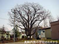 | (丘陵) | これはもう少し上流になります。 真駒内南小学校のミズナラです。そこにある看板を見ますと、推定樹齢300数十年ということです。ミズナラがでてきますとこれはもう扇状地面ではなくて、むしろ月寒丘陵の西端という地形にあたると考えていいと思います。ハルニレよりも乾いた条件のところにでてきます。 |